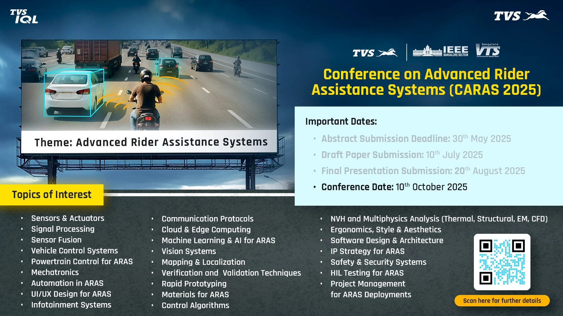 As TVS Motor Company embarks on its transformation journey through TVS Reimagine 2030, building a culture of innovation is crucial to driving breakthrough business outcomes. To support this vision, the TVSM IEEE Vehicular Technology Society (VTS) Special Interest Group (SIG) proudly announces the First IEEE VTS – TVSM Conference on Advanced Rider Assistance Systems (CARAS 2025). The event will be held on 10th October 2025 at Prof. Tsuda Hall, IQL, and will mark a significant milestone in our ongoing VTS journey at TVSM, which began in October 2023. As a Platinum Sponsor of IEEE VTS Conference for the Bangalore section during Sept 2024, TVSM had proudly contributed three technical papers from QA Electrical, R&D Software, and R&D Powertrain among a global set of 34 selected papers. CARAS 2025 aims to advance the dialogue and innovation in Advanced Rider Assistance Systems (ARAS) for two-wheelers, focusing on enhancing safety, comfort, and user convenience through cutting-edge technology.